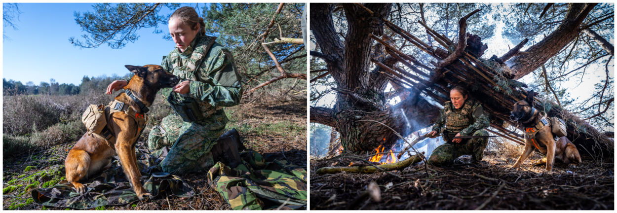 Sergeant Lonneke en Mechelse herder Cheetah zijn de eersten die als koppel deelnemen aan de AMPT-cursus en de SERE-B-kwalificatie. Beiden doorstonden de training met glans. Foto's: Louis Meulstee