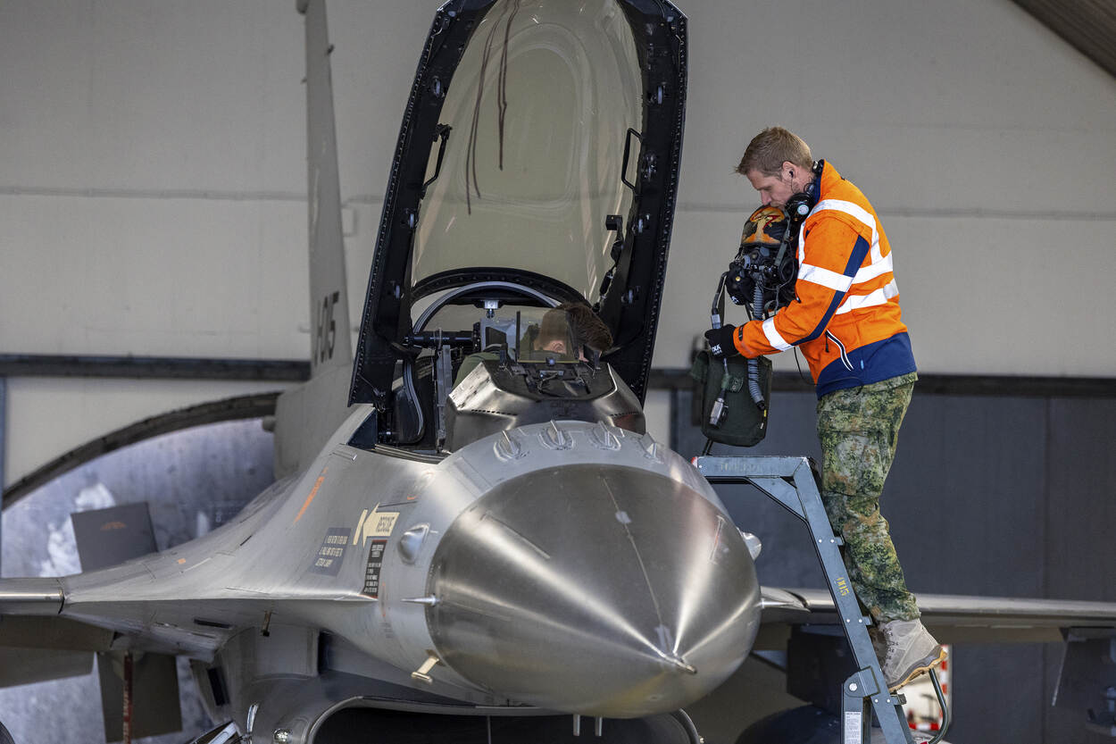 Een crewchief  van Vliegbasis Volkel helpt een F-16 vlieger bij de voorbereiding op zijn missie.