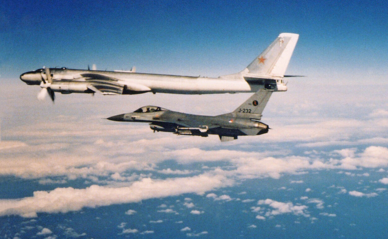 Een Nederlandse F-16 vliegt naast een Russische bommenwerper van het type Tupolev Tu-95, bijgenaamd Bear.