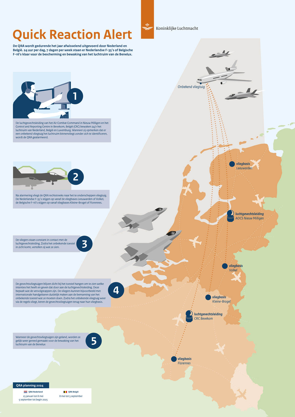 Sinds 2017 voert het CLSK QRA’s uit in samenwerking met de Belgische luchtmacht. Een efficiëntiemaatregel die voortvloeide uit de defensiebezuinigingen van de afgelopen decennia waarbij veel materieel en personeel van beide krijgsmachten werd geschrapt. Nick: “De QRA met de Belgen is ook een goed voorbeeld van militaire samenwerking in Europa.”
