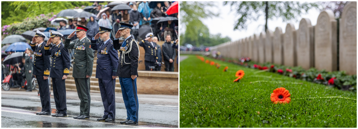 (Onder)commandanten van de operationele commando’s brengen de eregroet bij het monument op de Grebbeberg. Op de aangrenzende begraafplaats zijn de graven van militairen voorzien van oranje gerbera’s.