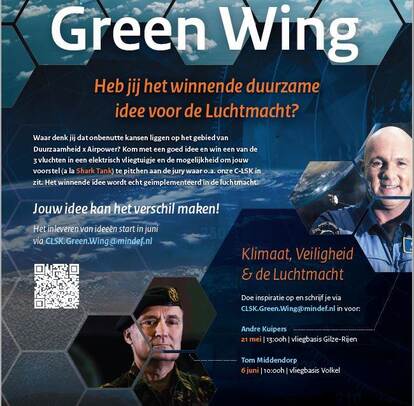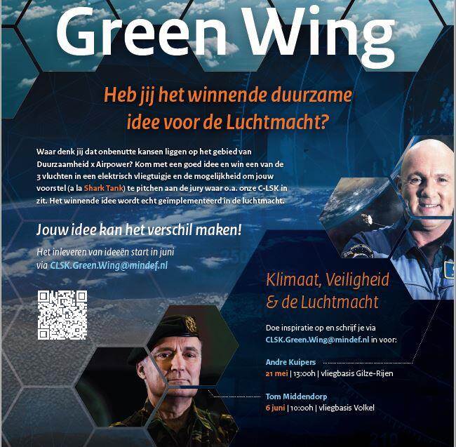 Luchtmachtmedewerkers kunnen ideeën voor duurzame initiatieven binnen hun eigen organisatie inzenden via CLSK.Green.Wing@mindef.nl. Via dit mailadres kunnen luchtmachters zich ook inschrijven voor de vervolg inspiratiesessie op 6 juni met generaal b.d. Tom Middendorp. De bedenkers van de beste ideeën mogen hun initiatief pitchen aan onder meer de Commandant Luchtstrijdkrachten luitenant-generaal André Steur. Ook wint de top 3 een privévlucht in een elektrisch vliegtuigje.