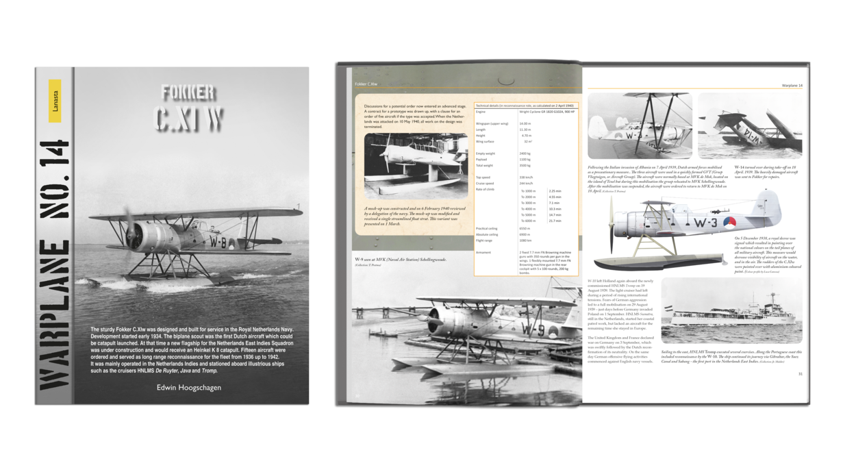 Luchtvaartauteur Edwin Hoogschagen zit niet stil. Na zijn boek van vorig jaar over de relatief onbekende jager CW-21, nu wederom een boek over een niet al te bekend type: de Fokker C.XIw – inderdaad, met kleine letter w. Het robuuste watervliegtuig is ontworpen en gebouwd voor dienst bij de Koninklijke Marine. De ontwikkeling begon begin 1934. De tweedekker-verkenner was het eerste Nederlandse vliegtuig dat met een katapult vanaf schepen gelanceerd kon worden. Op dat moment was een nieuw vlaggenschip voor het Nederlands-Indië-Squadron in aanbouw met een Heinkel K 8-katapult. Vijftien vliegtuigen werden besteld en dienden van 1936 tot 1942 als langeafstandsverkenning voor de vloot. Het toestel werd voornamelijk ingezet in Nederlands-Indië en gestationeerd aan boord van schepen zoals de kruisers Hr.Ms. De Ruyter, Java en Tromp. Ondanks buitenlandse belangstelling bleef de productie steken op vijftien exemplaren voor de Marineluchtvaartdienst. Niet een exemplaar overleefde de Tweede Wereldoorlog.