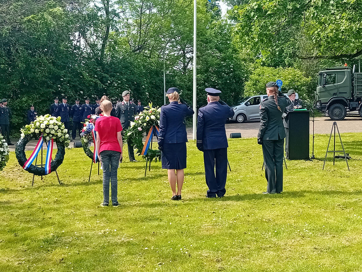 Onder de aanwezigen bij de herdenking aan het ILSY- plantsoen in Den Haag waren onder meer de voorzitter van de Eerste Kamer prof. dr. Jan Anthonie Bruijn, de eerste ondervoorzitter van de Tweede Kamer Tom van der Lee, de Gouverneur der Residentie luitenant-generaal Annelore Roelofs (Koninklijke Marechaussee) en de vertegenwoordiger van de Commandant Landstrijdkrachten generaal-majoor Wilfred Rietdijk. Tevens waren de burgemeesters van de om Den Haag liggende gemeentes aanwezig om een krans te leggen bij het oorlogsmonument. Ook stonden diverse eenheden van de landmacht een detachement van het 519 Squadron van de Groep Luchtmacht Reserve (GLR) opgesteld. Dat stond traditiegetrouw onder bevel van kapitein Adriaan van Rossum. Namens de Koninklijke Luchtmacht legden commodore Ellen Meeuwsen-Scholten, directeur HR & Bedrijfsvoering CLSK, en majoor b.d. Wim Lutgert, militair historicus, een krans. Sergeant Jeffrey Kloek van de GLR, onderscheiden met het Kruis van Verdienste, legde een krans namens de Vereniging Dragers Militaire Dapperheidsonderscheidingen. Foto: wachtmeester b.d. Michael van der Zee