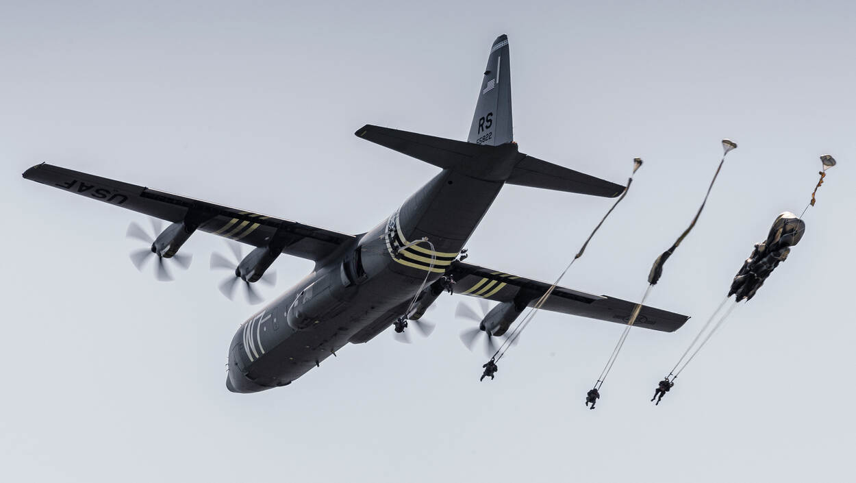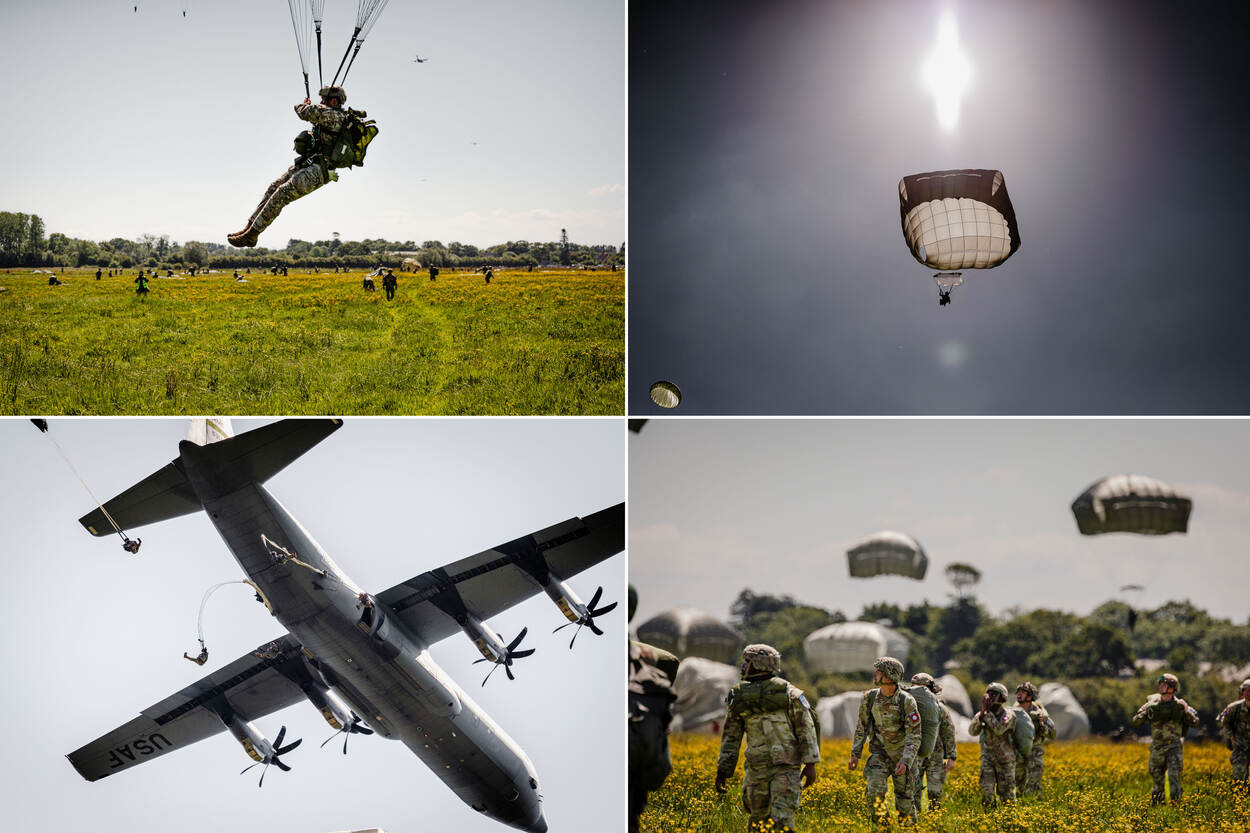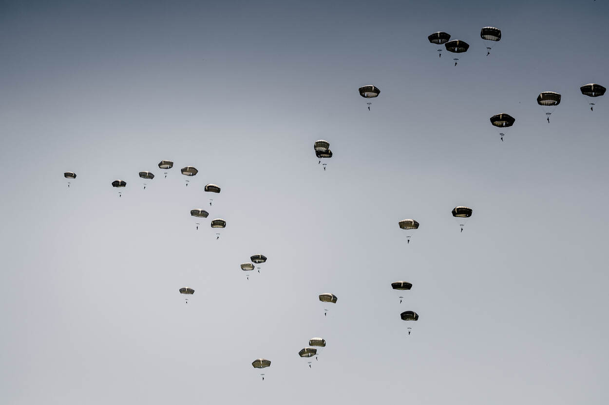 Parachutisten springen uit een van de Amerikaanse C-130’s. Na het overvliegen van de transportvliegtuigen is de lucht gevuld met parachutisten.
