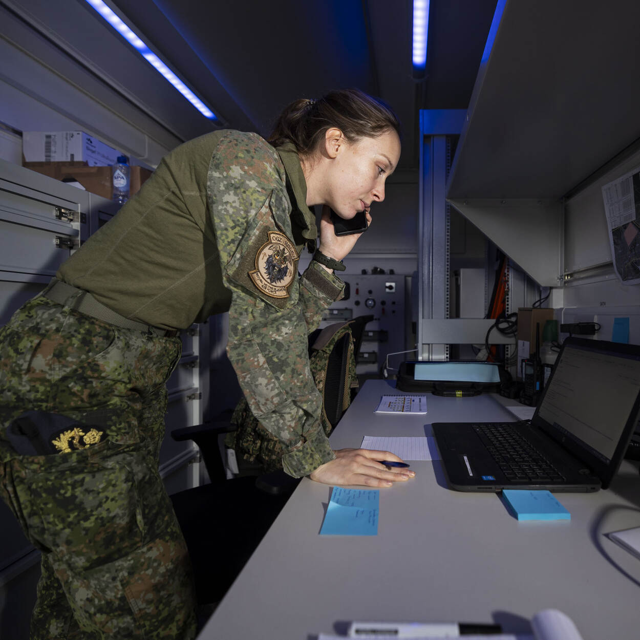 Eerste luitenant Danique staat met een telefoon aan haar oor.