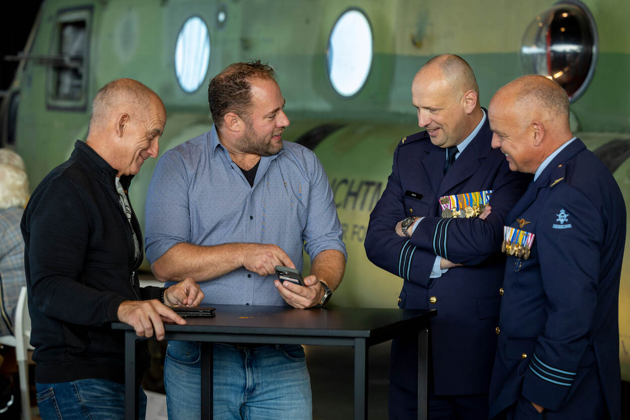 Marco van der Meijden praat met twee actieve militairen in uniform en een postactieve veteraan aan een statafel. Op de achtergrond een Chinook.