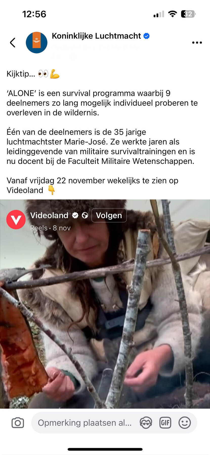 Alleen overleven in de natuur? Dat is de opdracht van de deelnemers aan ALONE. Onder hen is ook luchtmachtmilitair Marie-José. Ze werkte jarenlang als leidinggevende van militaire survivaltrainingen en is nu docent bij de Faculteit Militaire Wetenschappen. Meer zien en lezen? Klik dan op deze link.