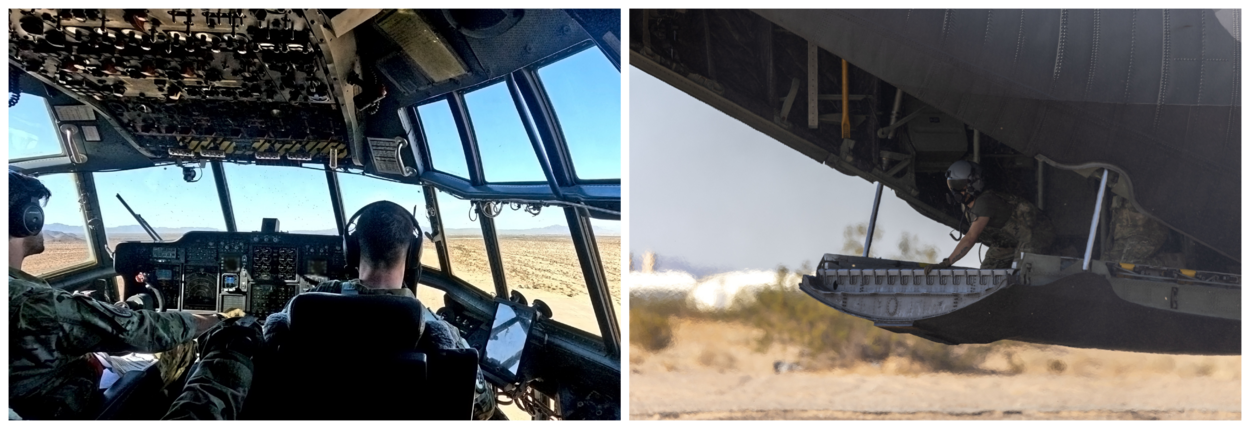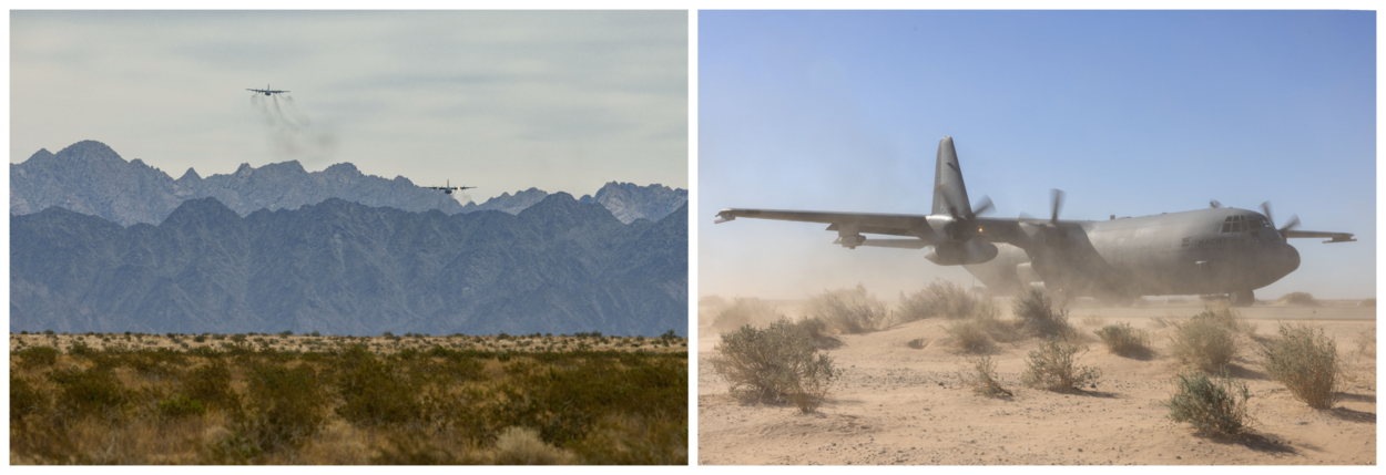 De vliegers op de C-130’s kregen het behoorlijk voor de kiezen op de oefenterreinen rond Yuma. Aanvliegen boven de woestijn en landen op dirt strips.