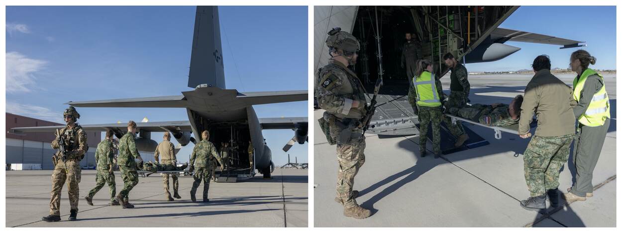 Het Air Mobile Protection Team komt aan om evacuaties te beveiligen. Vervolgens gaan oefengewonden via het platform naar de Hercules.