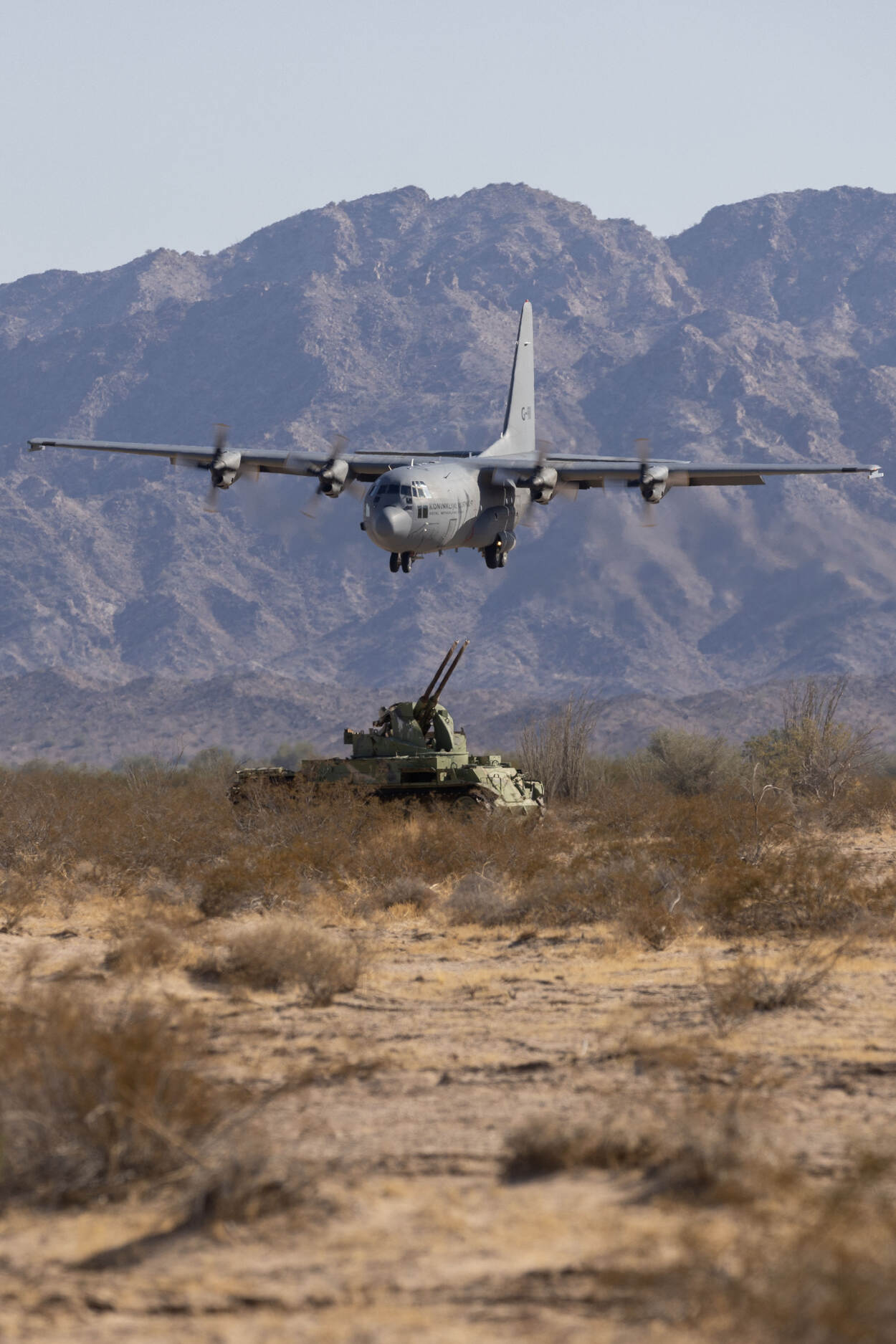 Een C-130 vliegt laag over het terrein waarin een pantserwagen tegen luchtdoelen staat opgesteld.