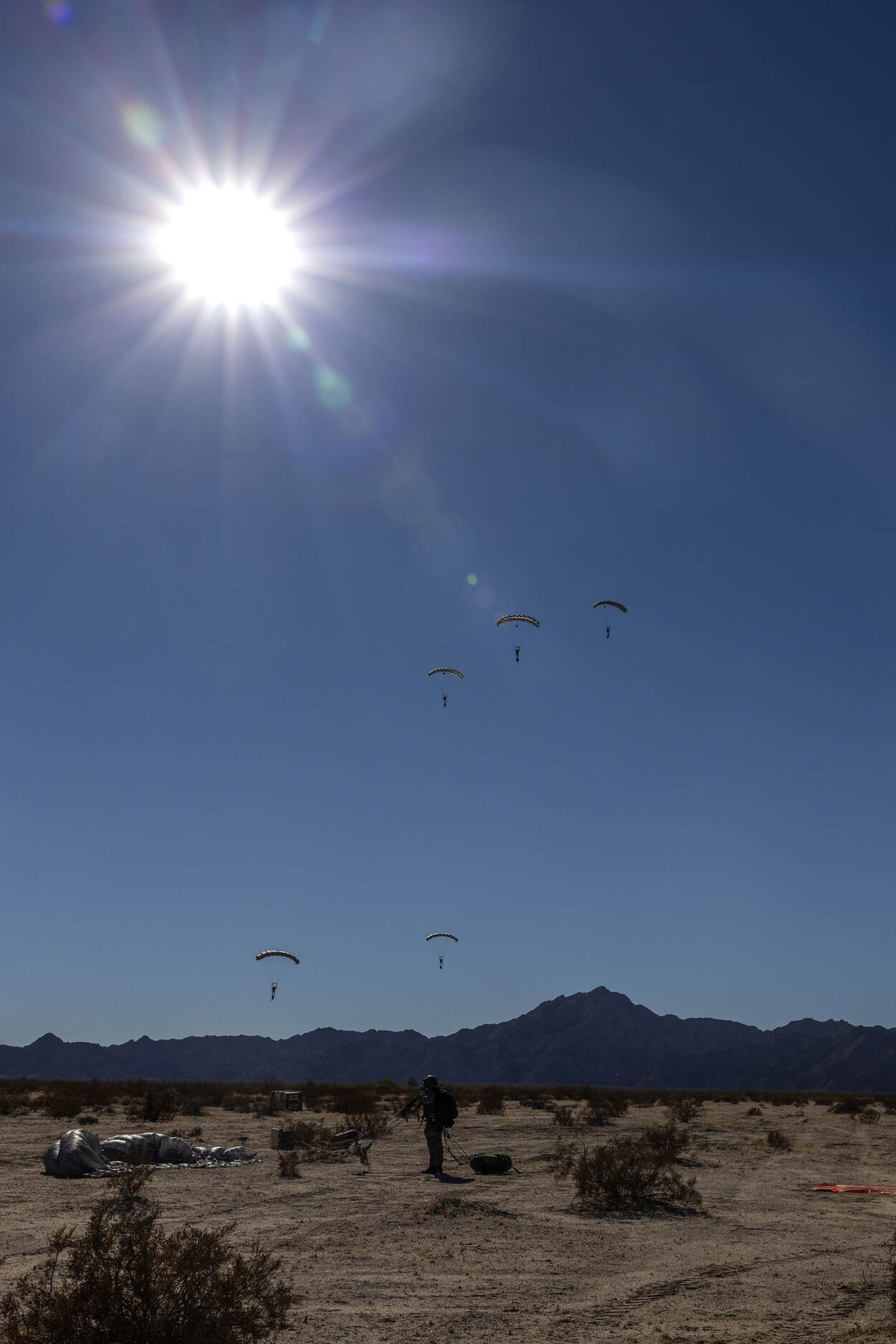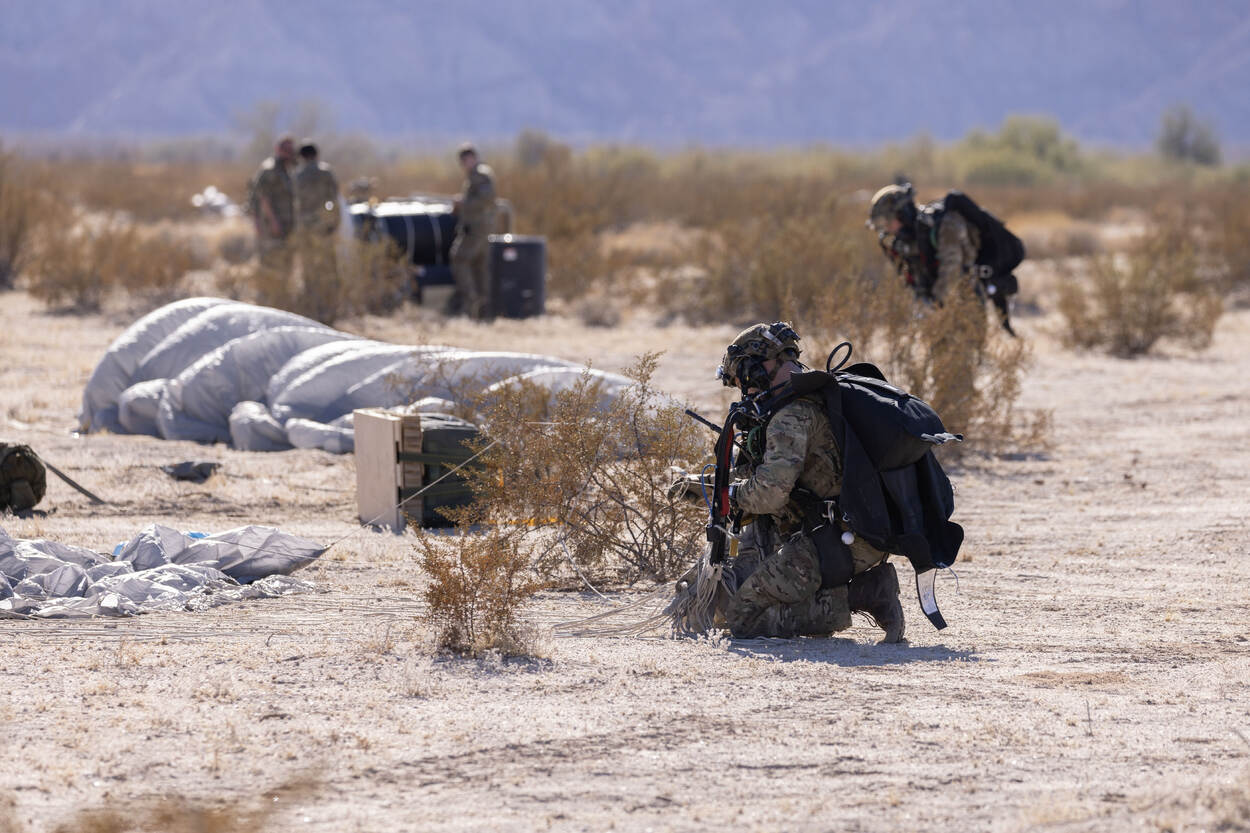 Een C-130 Hercules dropt goederen en parachutisten. Het materieel en de militairen landen vervolgens in de woestijn.