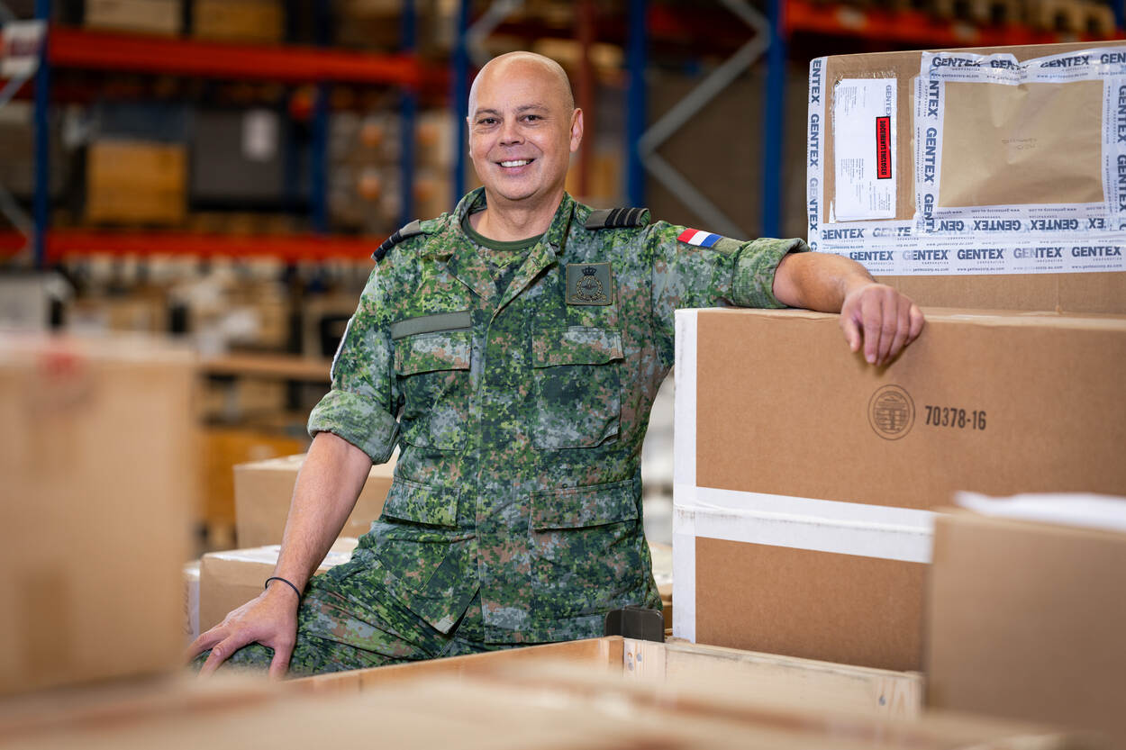 Luitenant-kolonel Peter staand tussen de dozen in het magazijn van Logistiek Centrum Woensdrecht.