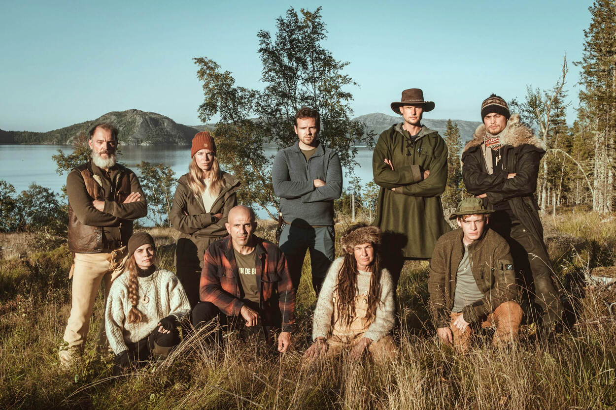 De negen deelnemers van de Nederlandse editie van Alone. Tweede van links, staand: Marie-José. Tweede van rechts, zittend, winnares Daan.