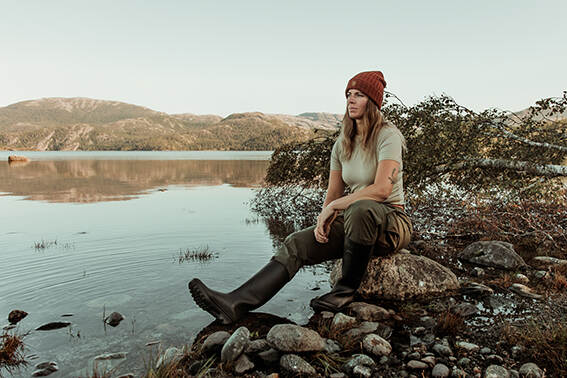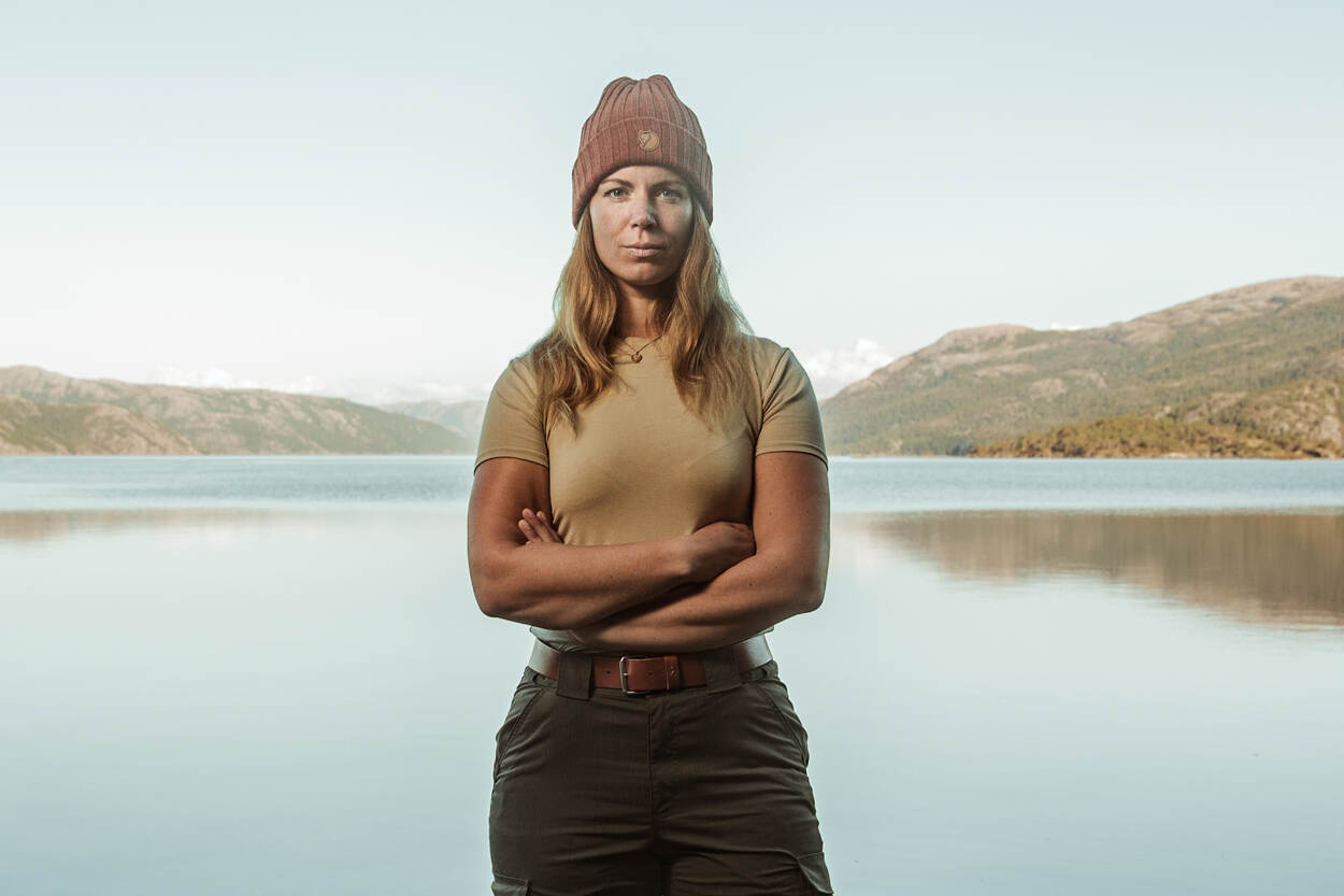 Majoor Marie-José Spek zit in outdoor-kleding aan de rand van een meer in Noorwegen.