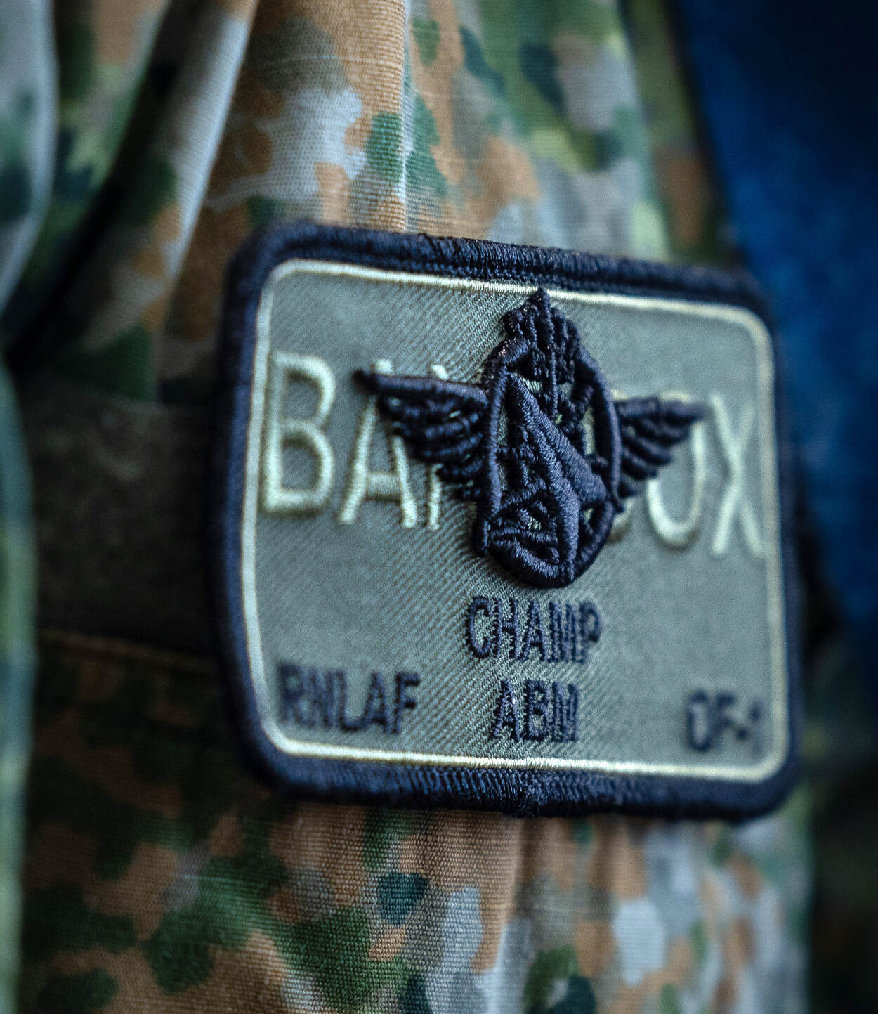 Een badge met daarom het callsign ‘Champ’. Daaronder de afkortingen RNLF en ABM.