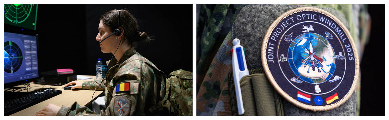 Een Roemeense militair zit achter een computer, waarop een radar te zien is. Rechts: Het embleem van JPOW op de mouw van een militair.