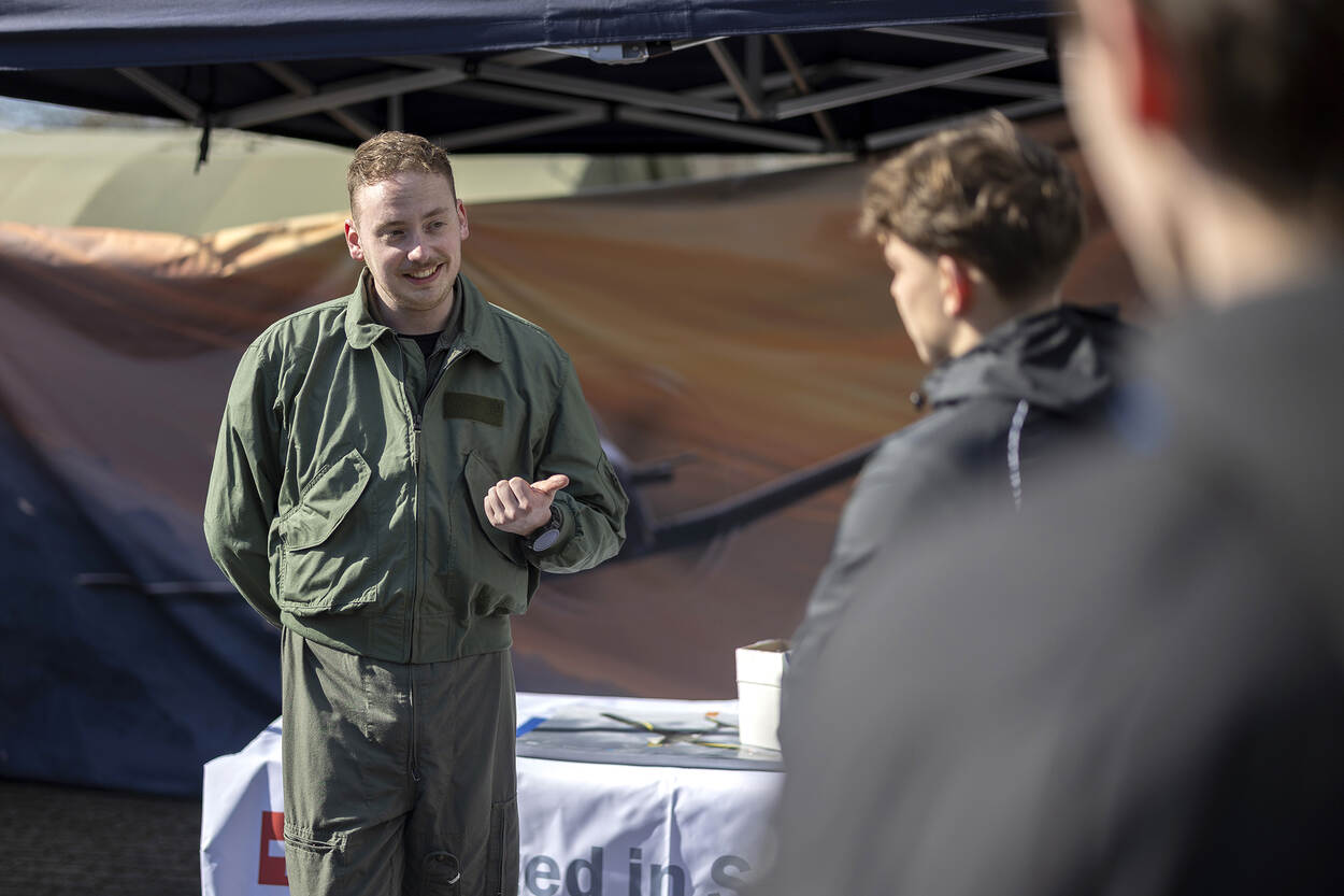 Een vlieger wordt bij zijn informatiestand omringt door scholieren met tal van vragen. “De meesten willen weten hoe zwaar de opleiding is en hoe je je goed kunt voorbereiden”, vertelt hij. Hun meegereisde ouders zijn minimaal zo nieuwsgierig; ‘Waarom niet bij de KLM?’ “Met een groot vliegtuig zou ik een eind rechtdoor kunnen vliegen en weer terug. Maar bij de luchtmacht krijg ik veel meer avontuur. Ik kom overal ter wereld en kan mensen helpen. Bovendien wordt mijn vliegopleiding betaald; ook niet gek.”