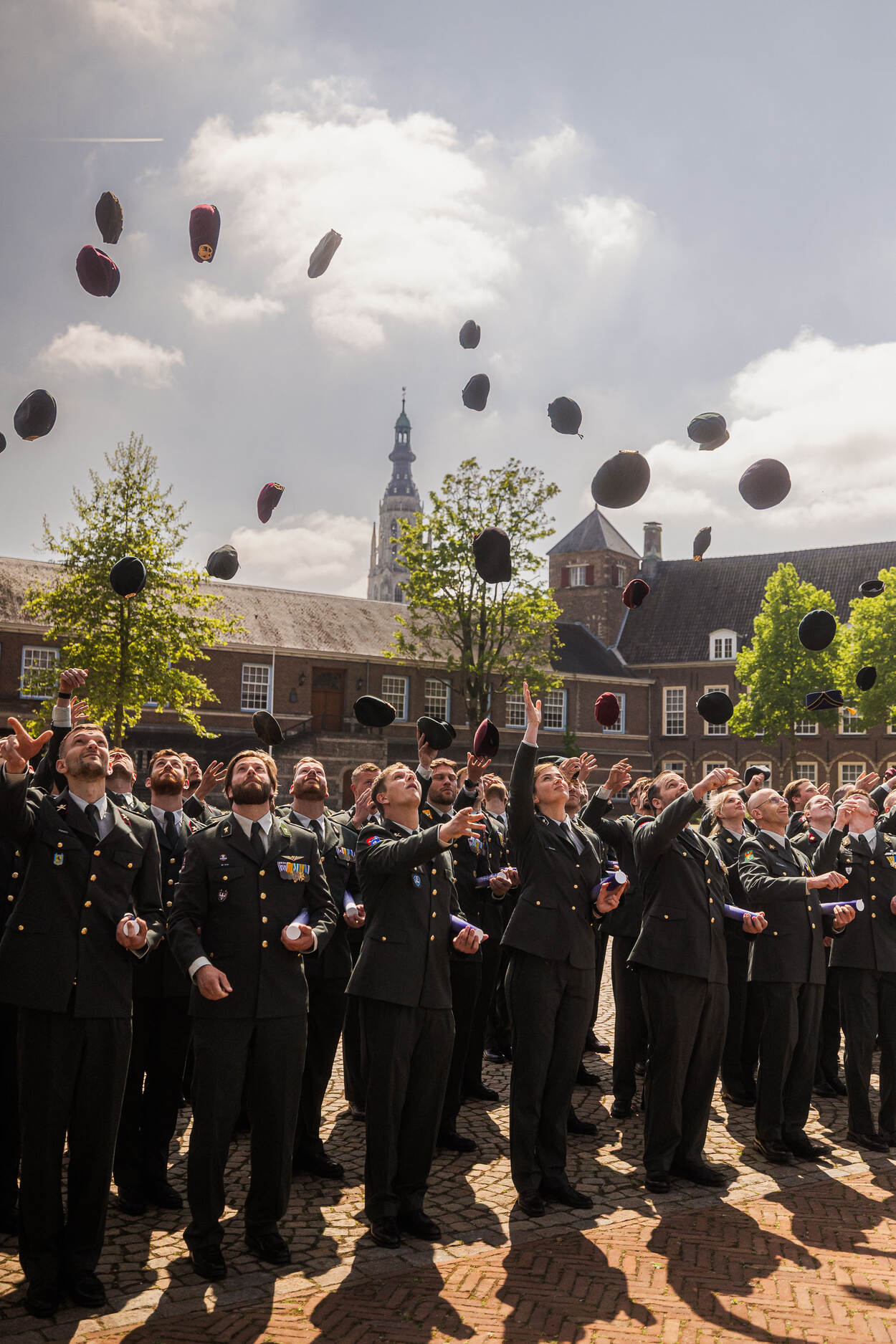 De diploma-uitreiking, ook wel Bullenparade genoemd, op het Kasteel van Breda werd traditioneel afgesloten met het vrolijke ‘pettenmoment’. Daarbij gooien voormalige cadetten tegelijkertijd hun pet of baret in de lucht. De nieuwbakken officieren gaan aan de slag bij een van de operationele krijgsmachtdelen. Foto’s: sergeant Jasper Verolme