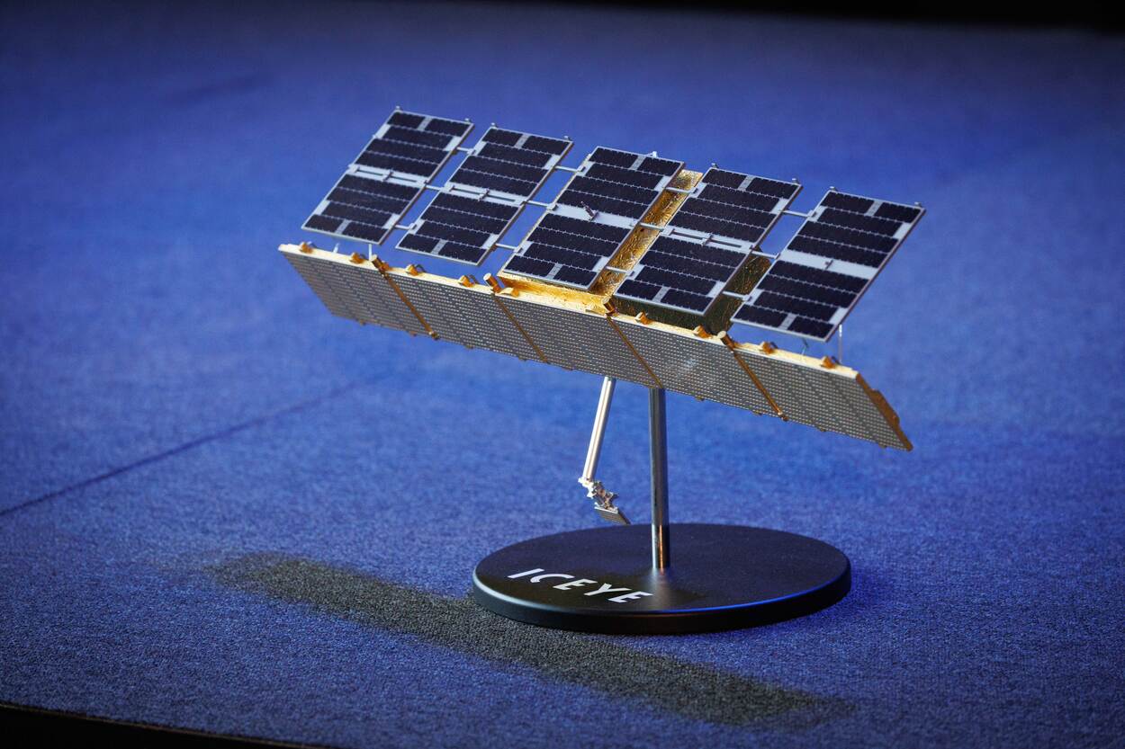 Modellen van reeds gelanceerde SAR-satellieten, rechts op schaal en links op ware grootte van liefst vier meter breed.