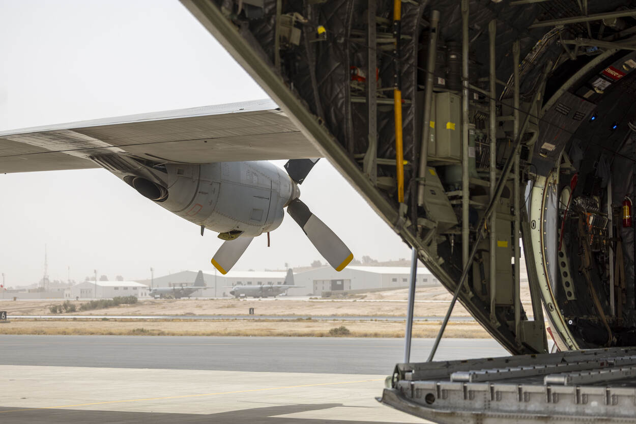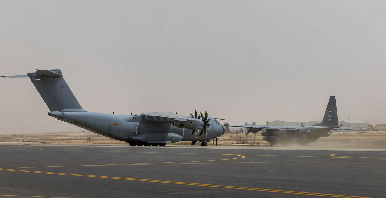 En Jordaanse C-130 keert terug van een drop boven Gaza. De Belgische A400M op het platform moet nog aan de vlucht beginnen.