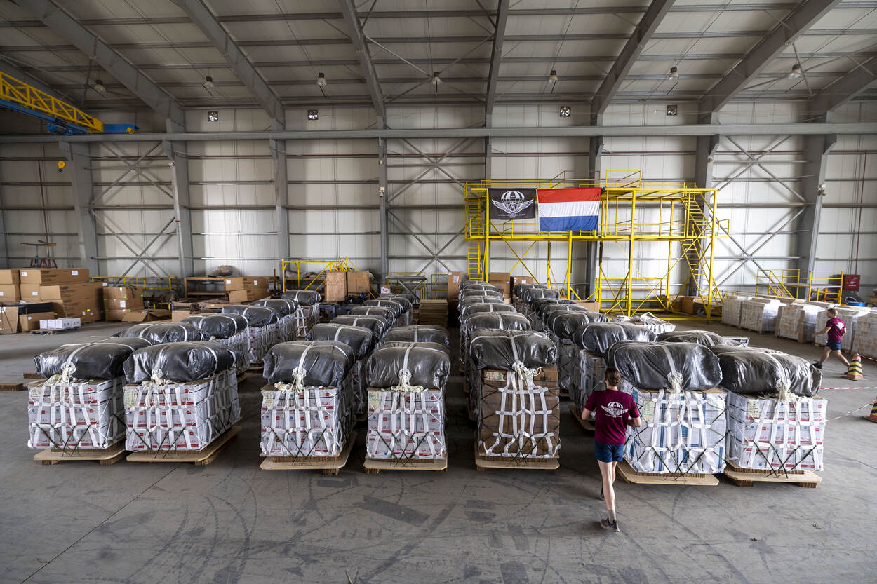 In een hangar staan lange bundels noodgoederen opgesteld in rijen. In de achtergrond een Nederlandse vlag.