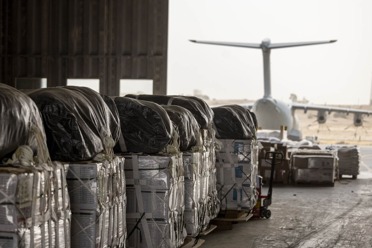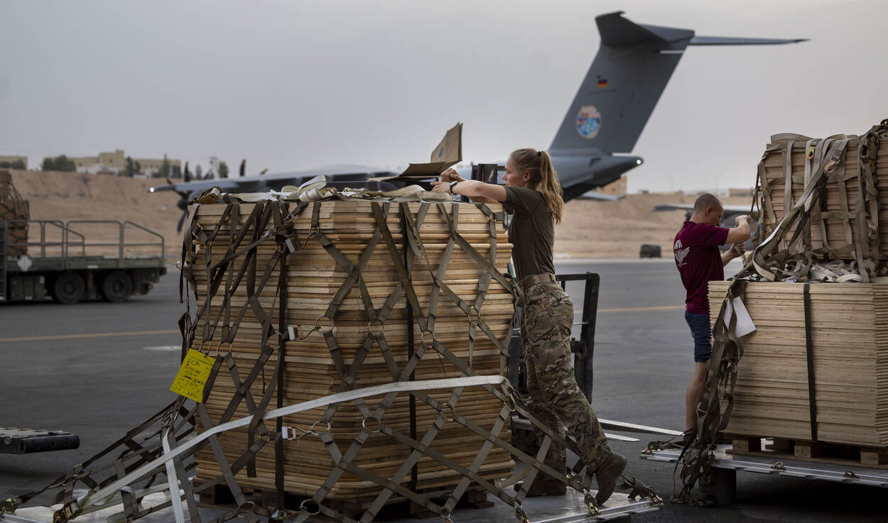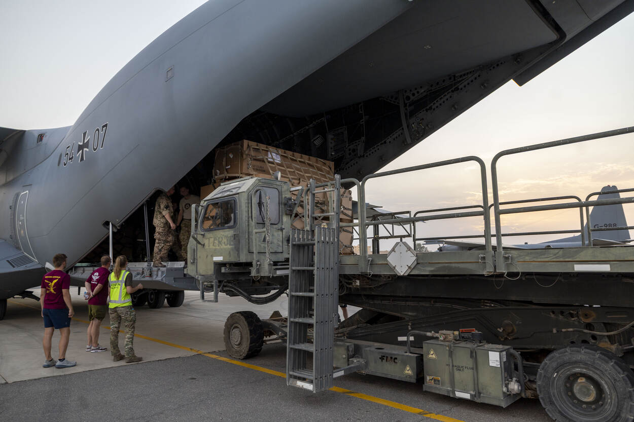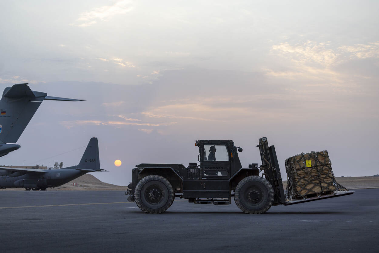 Meerdere landen doen meer aan de voedseldroppings boven Gaza. Met in de achtergrond de Nederlandse C-130, wordt een A400M van de Duitse luchtmacht beladen.