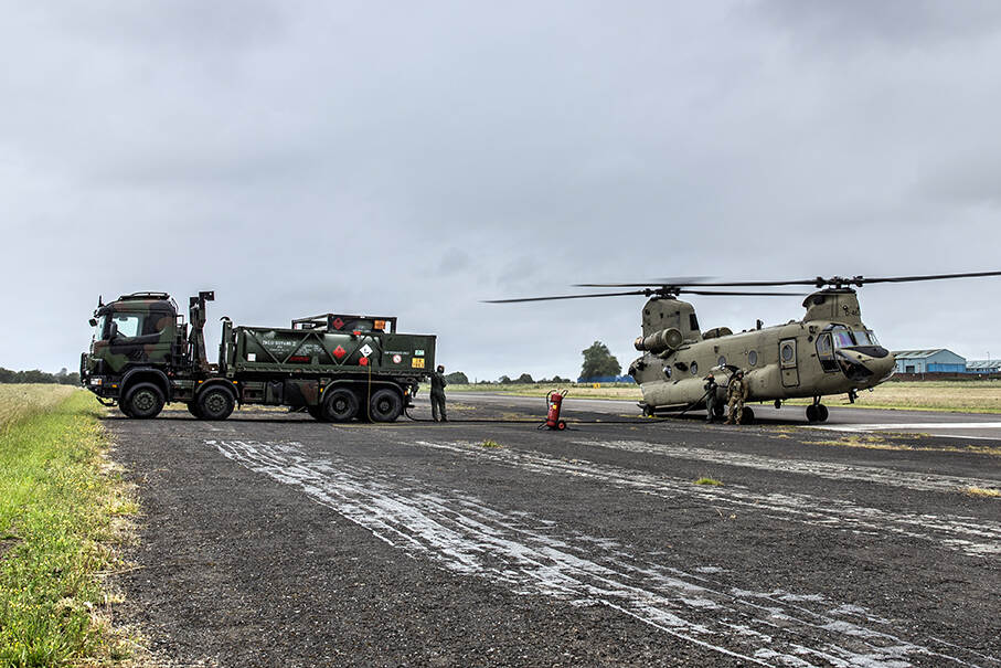 Twee Chinooks vliegen achter elkaar door de lucht. Een daarvan verplaatst een auto aan een zogenoemde sling onder de helikopter.