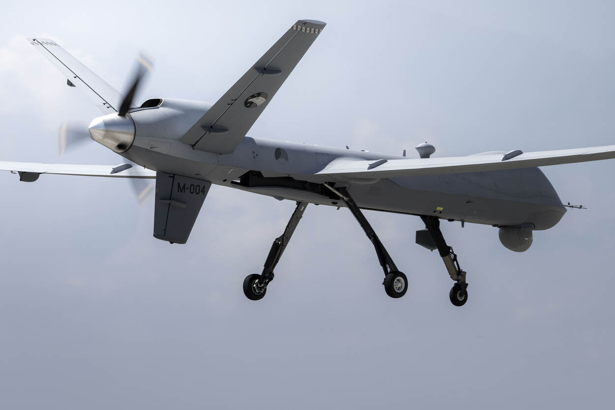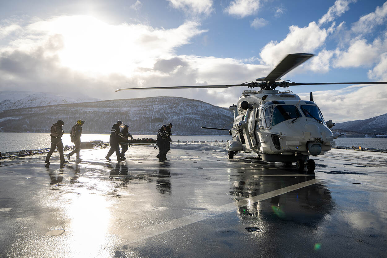 Afbeeldingen van een Chinook, een NH90, een MQ-9 Reaper en twee F-35’s die over een marineschip vliegen.