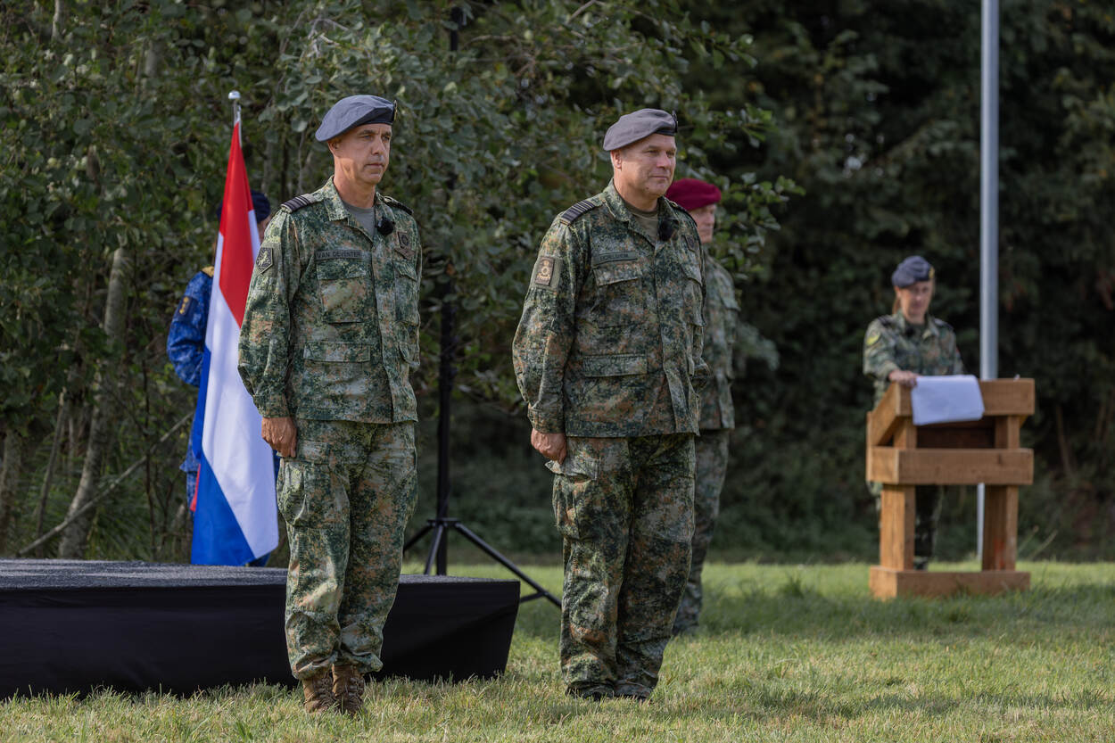 Commandant der Strijdkrachten generaal Onno Eichelsheim draagt de vlag van het NLD JFC over aan generaal-majoor Johan van Deventer. Daarnaast staan de twee naast elkaar in de houding.