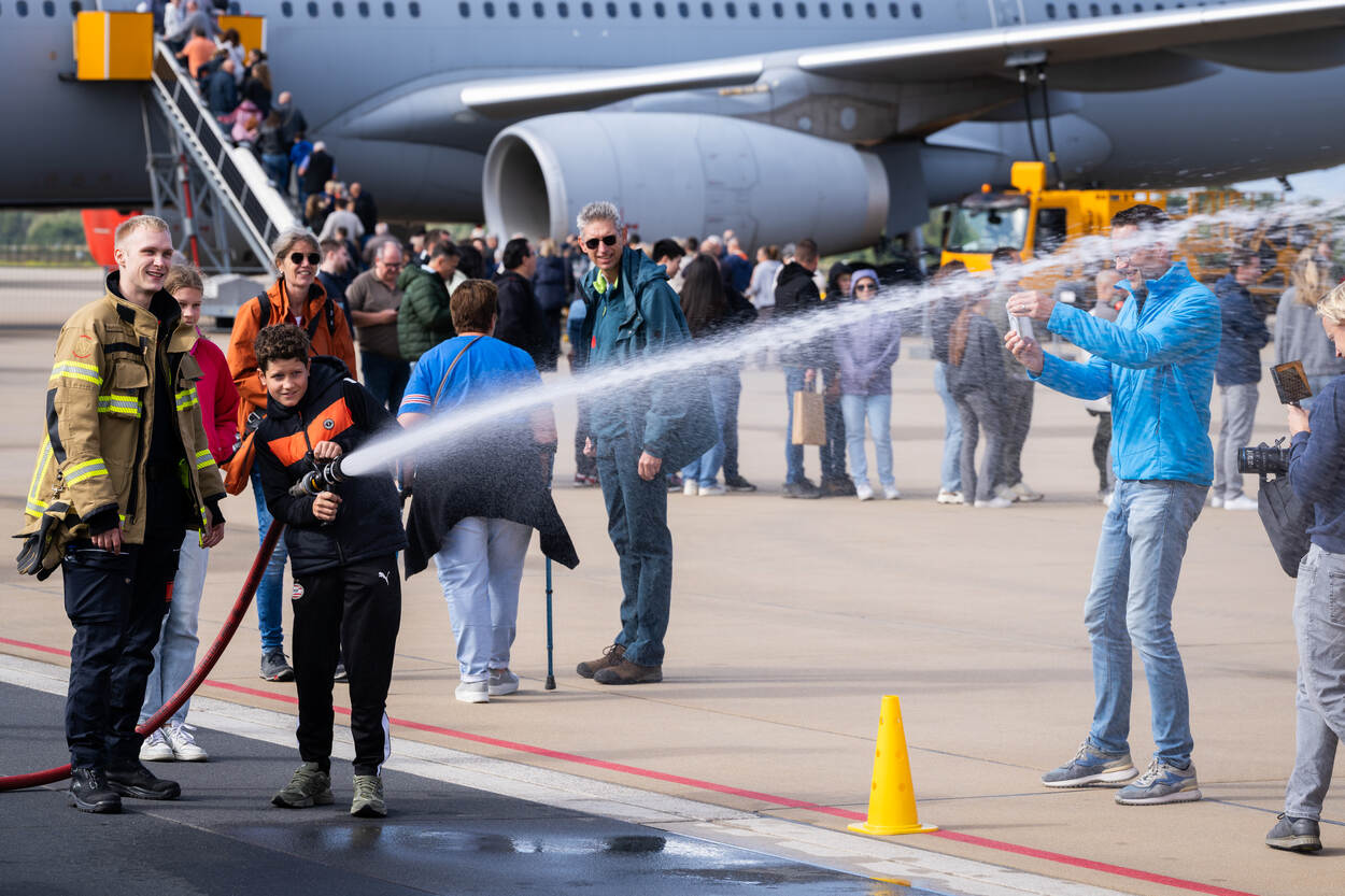 Bezoeker spuit met een brandweerslang, op de achtergrond een rij bij een tankvliegtuig.