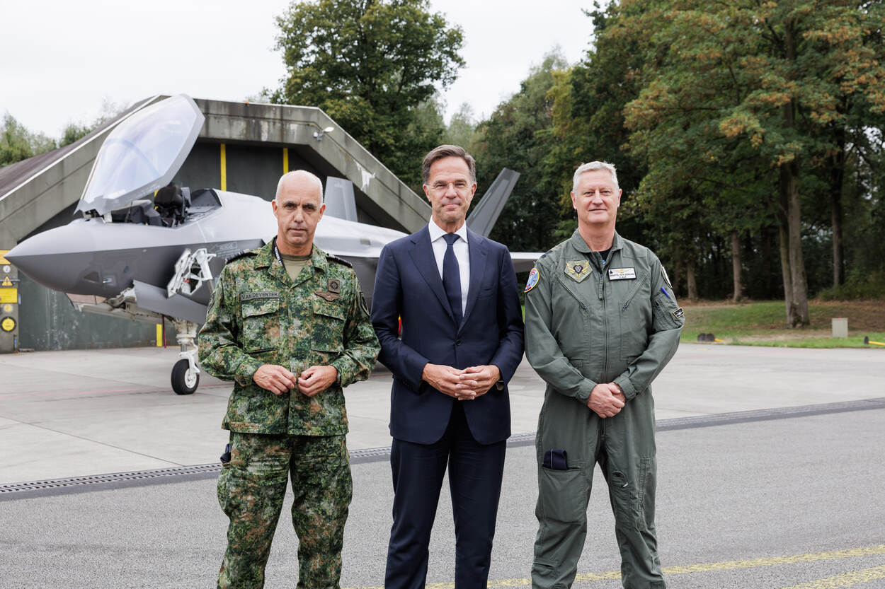 Rutte temidden van Van Deventer en Van Egmond voor een F-35.