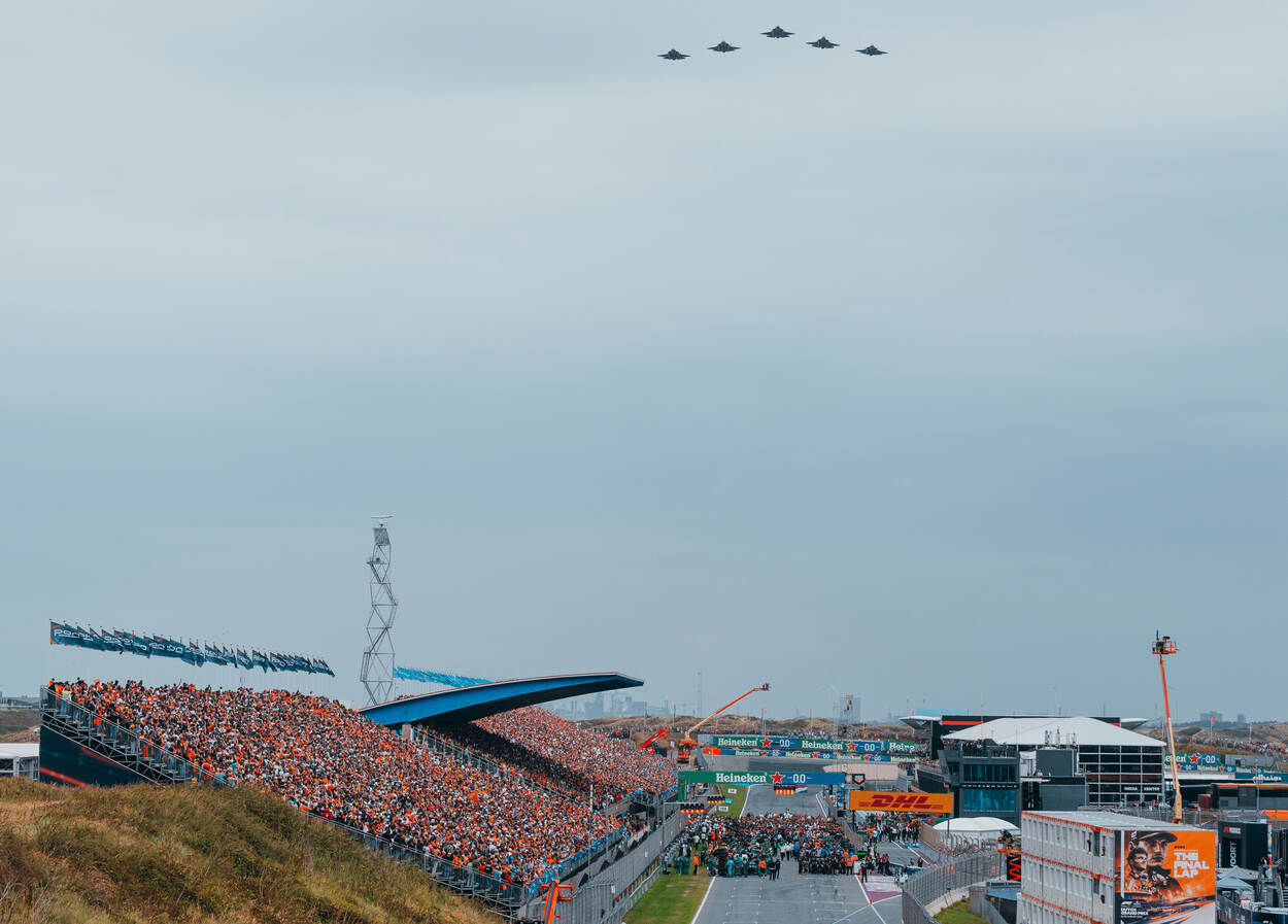 Bij veel internationale sportevenementen is een fly-by een vast onderdeel van de openingsceremonie. Het symboliseert verbondenheid, nationale trots en markeert het officiële startmoment. Ook binnen de Formule 1 is het gebruikelijk dat er voorafgaand aan de race zo’n eerbetoon plaatsvindt. Uiteraard wordt dit altijd uitgevoerd in nauwe afstemming met de betrokken autoriteiten, waarbij veiligheid en zorgvuldige voorbereiding voorop staan. Foto boven: Nikki van Toorn. Foto onder: Jelle Dreesen