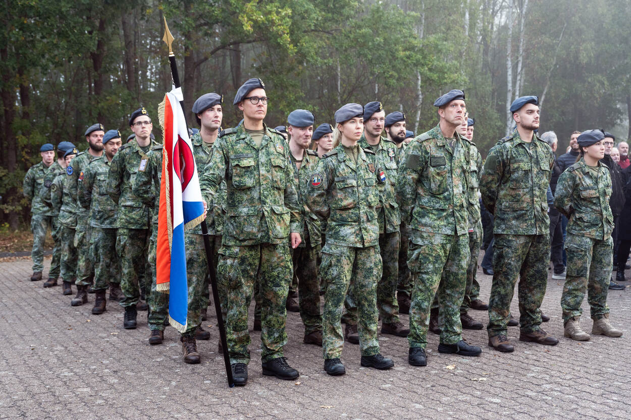 Een rij militairen in de houding, waar bij enkelen een vlag vasthouden.