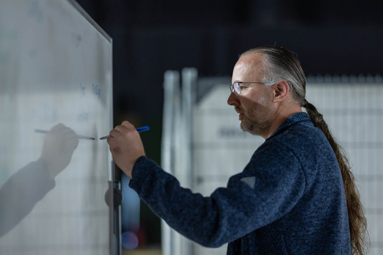 Een man met een lange staart schrijft met een marker op een wit bord.