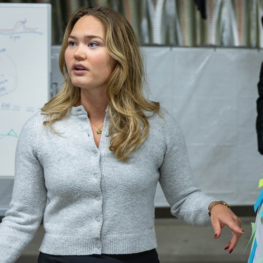 In een hoek achterin de hangaar is eerste luitenant Piene Claessen met haar groepje bezig met de afronding van hun product: een automatische routeplanner voor de Chinooks. In de huidige situatie voeren vliegers handmatig coördinaten in op het moment dat ze hun route onderweg wijzigen. Deze nieuwe visuele kaart genereert zelfstandig een nieuwe route van punt A naar B en houdt daarbij rekening met onder meer afstand, hoogtes, de aanwezigheid van steden en mogelijke dreigingen. Druk voert het team de laatste gegevens in voordat ze over enkele uren hun resultaat presenteren. “Je merkt dat het krap is om zoiets in drie dagen te maken. Maar, ik hoop stiekem dat we hiermee verder kunnen gaan”, zegt data scientist Claessen enthousiast. “Dit is écht iets dat het squadron kan gebruiken.”