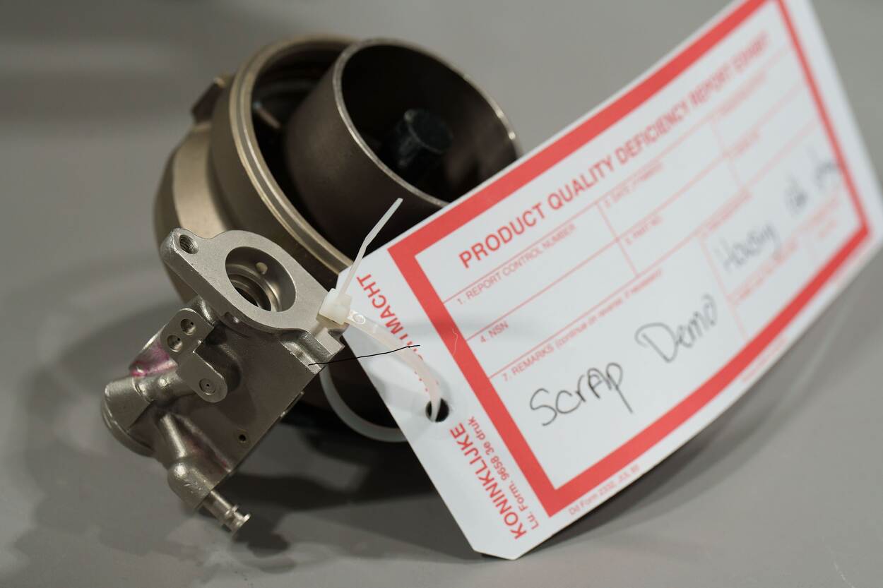 Voorhout legt uit dat het dossier van elke print voor beoordeling naar het Commando Materieel en IT (COMMIT) en de Militaire Luchtvaart Autoriteit gaat. Hierin zijn materiaaldata, sterktes, procesinstellingen en testrapportages opgenomen. Pas na goedkeuring mag het onderdeel daadwerkelijk de lucht in.